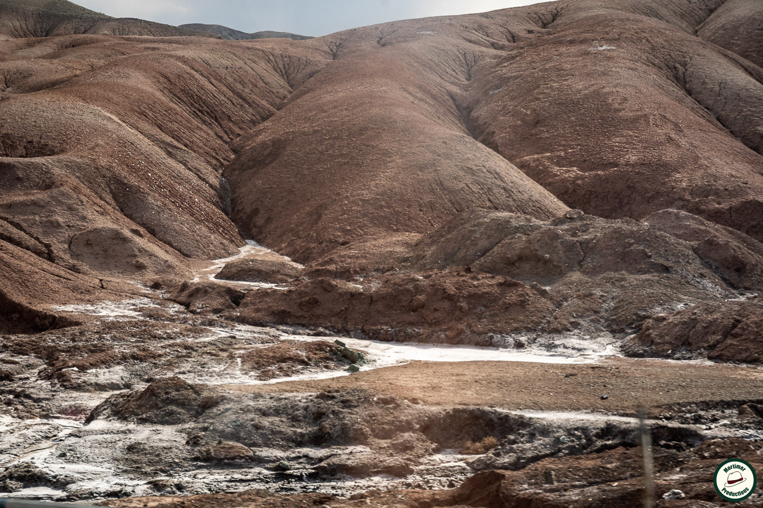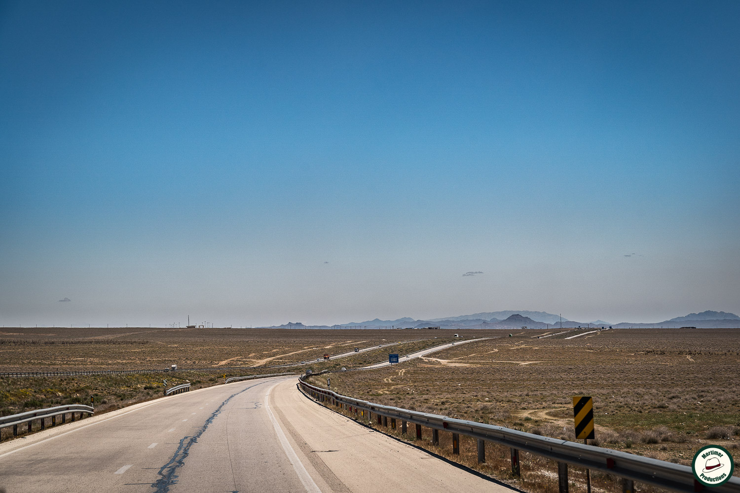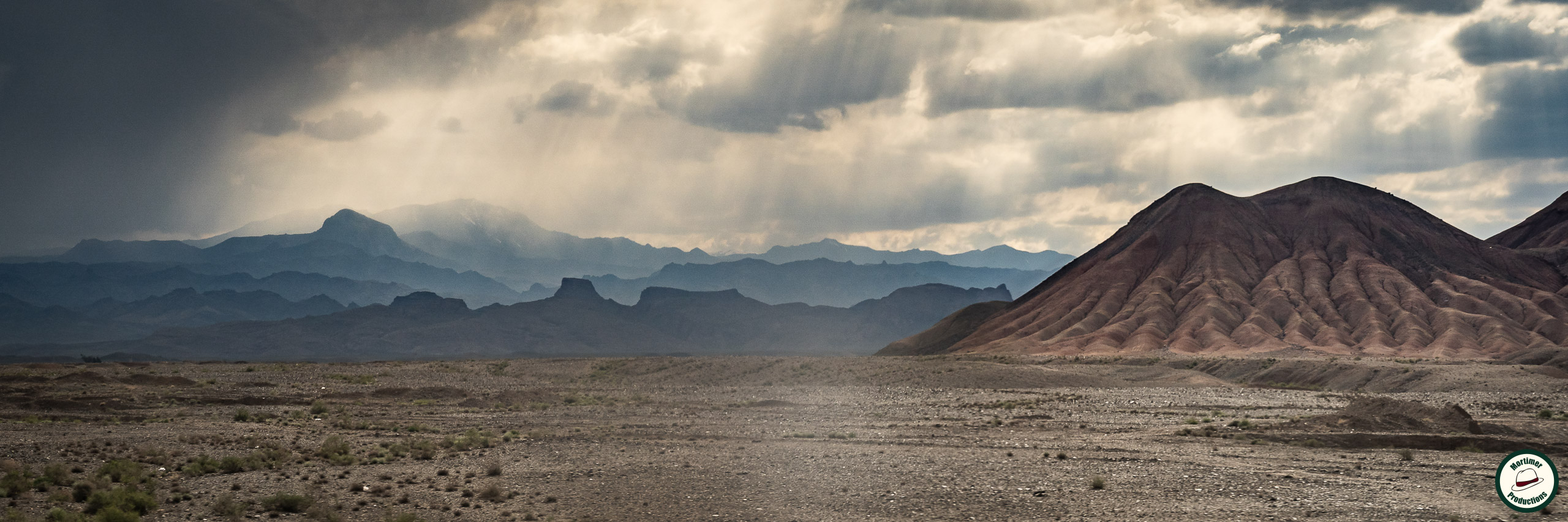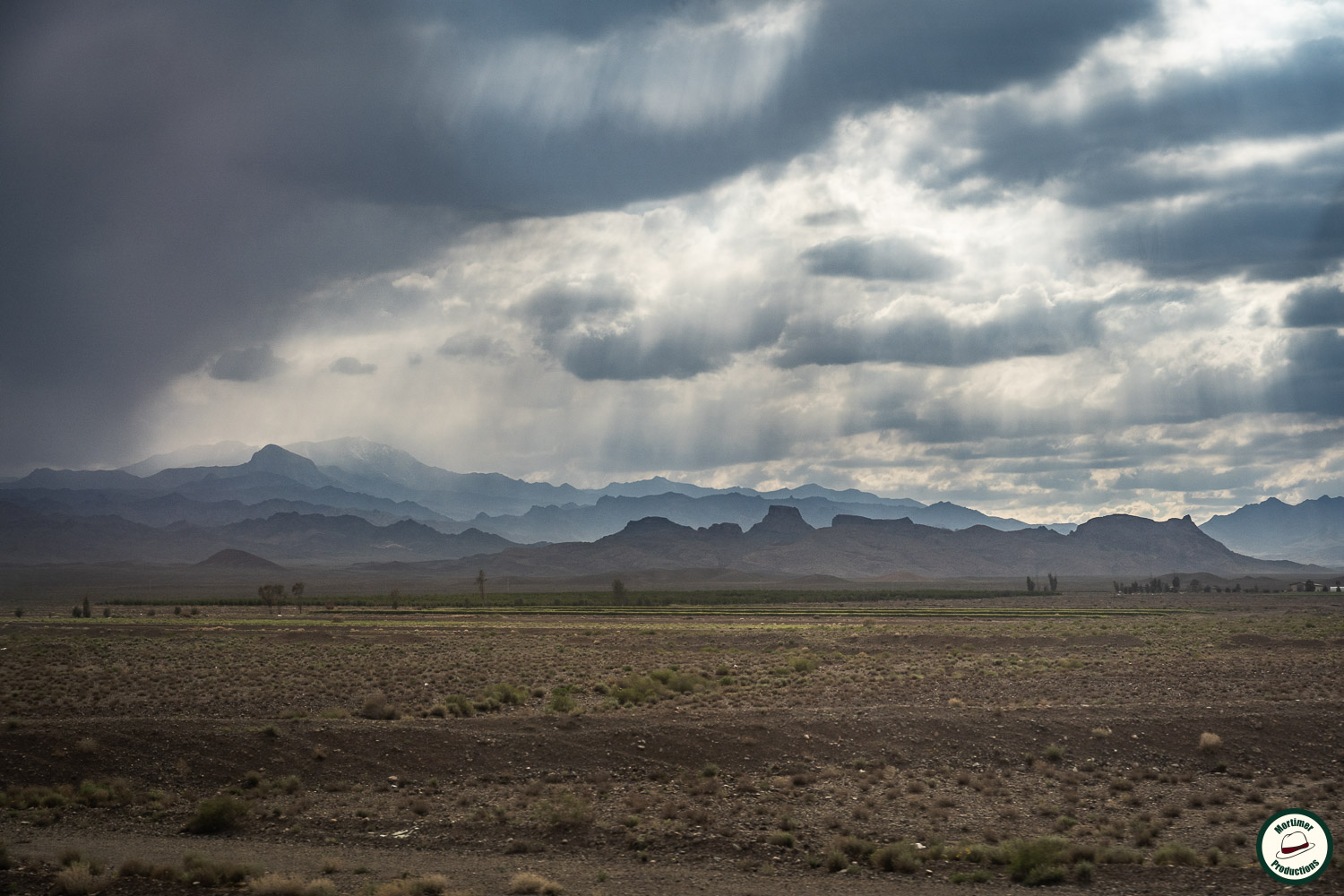 Als wir unseren Weg weiter in Richtung Süden fortsetzten, veränderte sich die Landschaft so langsam, aber sicher in das, was wir eigentlich erwartet hatten, als wir die Reise planten. Aus Berglandschaft und saftig grünen Feldern wurde zunehmend Steppe und Wüste. Eine leichte weiße Schicht war hier und da im rötlichen Sand zu erkennen. Anders als nur einige Tage zuvor handelte es sich hierbei allerdings um Salz und nicht um Schnee. Ein Unwetter zog in der Ferne auf und türmte die Wolken bombastisch hinter der hügeligen Landschaft auf. Grauschattierungen und Sonnenstrahlen verwandelten die Landschaft hier direkt in eine bahnbrechende Kulisse. Leider konnten wir nicht anhalten, daher konnte ich nur ein paar einzelne Aufnahmen aus dem Bus heraus machen. Die Stimmung war allerdings großartig und die Bilder gar nicht schlecht für ein „drive-by-shoot“.