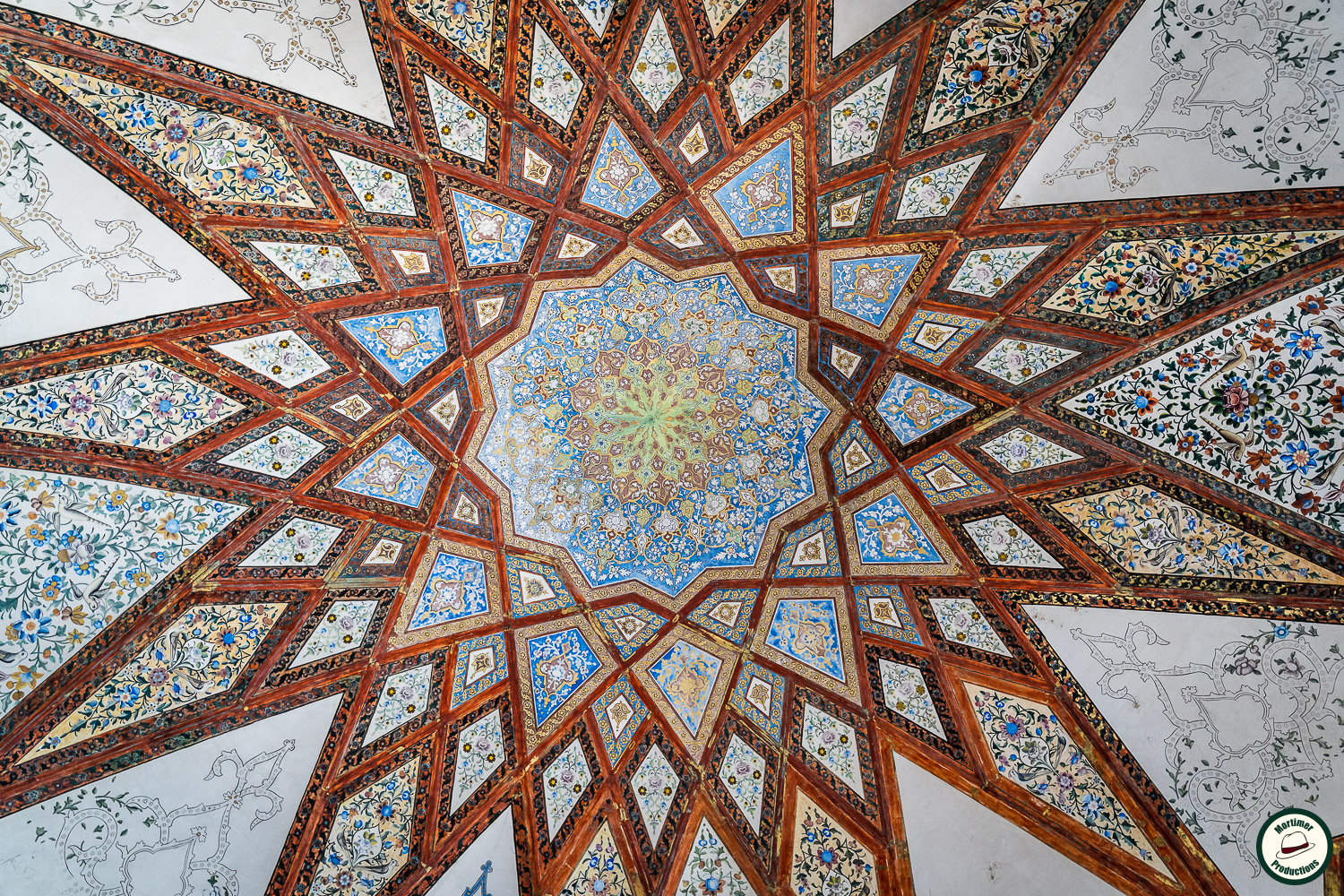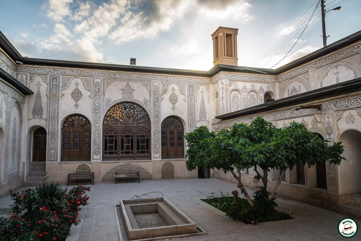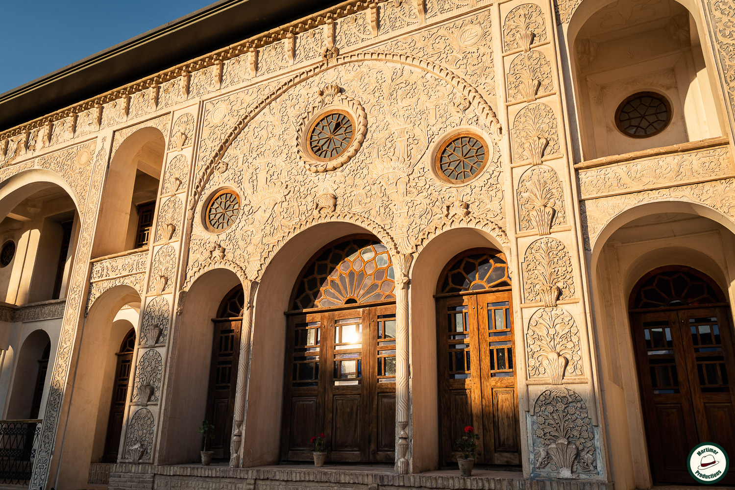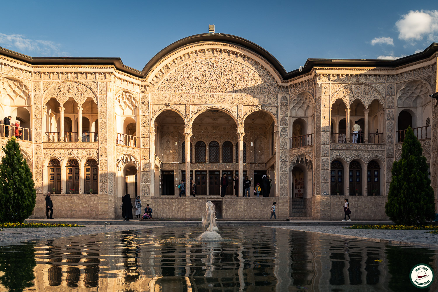 Unsere letzte Station in Kashan war das historische Haus des sehr vermögenden Kaufmann Sayyid Dscha’far Tabatabayi. Das Haus wurde während der Kadscharen-Dynastie 1834 erbaut. Dieses für iranische Verhältnisse relativ junge Bauwerk ist ein gutes Beispiel für die traditionelle Architektur und den Wohlstand der großen Handelsfamilien in den Oasenstädten. Das Anwesen besteht aus vier Innenhöfen umschlossen von Gebäudeteilen, welche mit aufwendigen Bögen, Wandmalereien und Buntglasfenstern verziert sind. Auch hier ließ sich wieder beobachten, wie die Perser praktischen Nutzen mit allerhand Ästhetik verbinden. Innenhöfe mit Wasserbassins und Bäumen sorgen für ein kühleres Klima als außerhalb der Höfe auf den Straßen der Wüste.