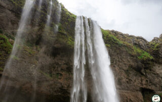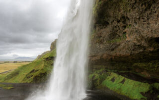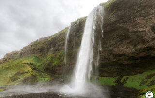Der Seljalandsfoss ist quasi ein begehbarer Wasserfall, da man unter dem Felsvorsprung, von dem er sich hinunterstürzt, entlang gehen kann. Mit über 60 Metern Fallhöhe ist der Wasserfall eine großartige Erscheinung, insbesondere wenn man darunter steht.
