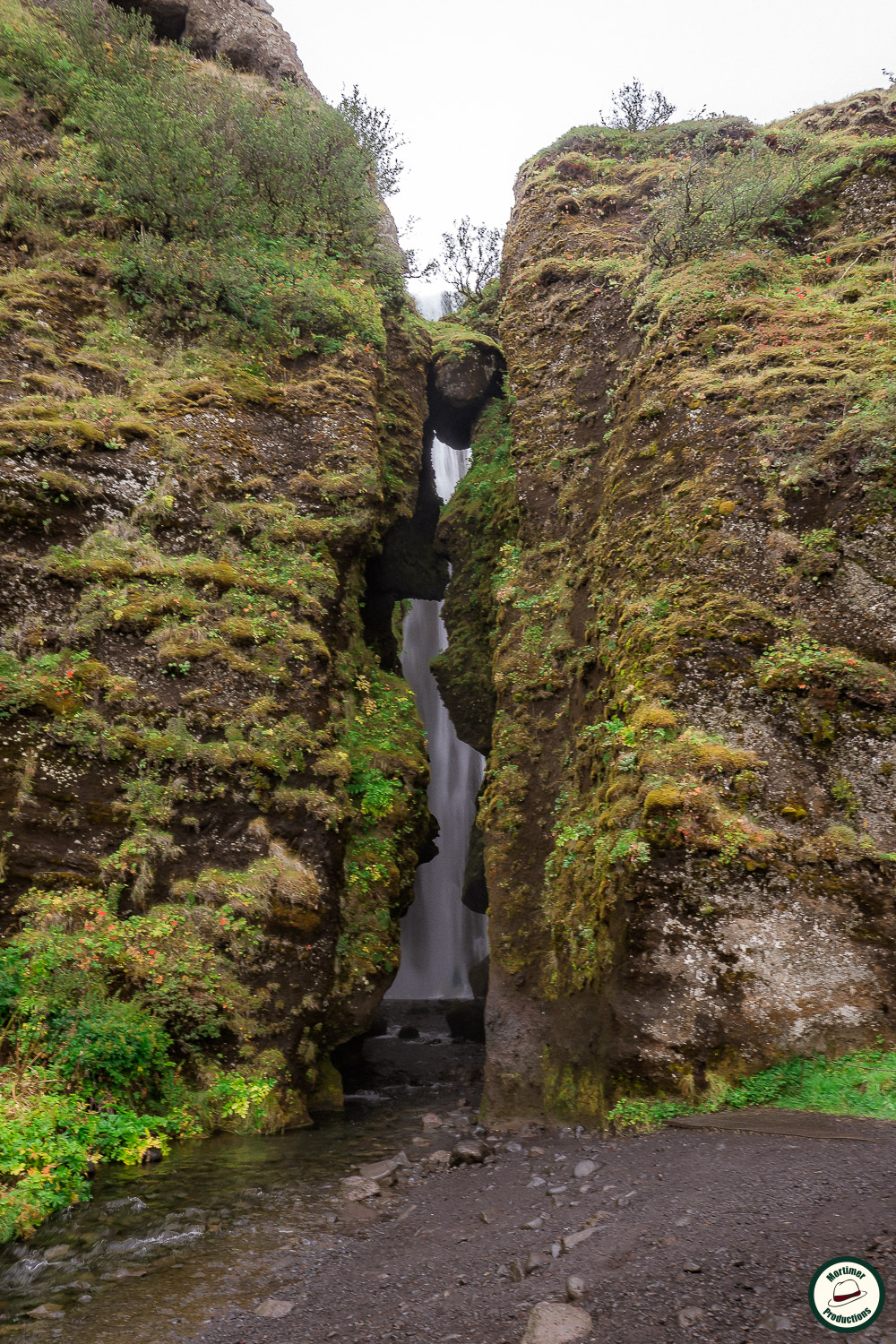 Wenige Meter entfernt wartete ein weiterer Wasserfall in einer kleinen Grotte. Der Gljúfrabúi ist von außen kaum zu erkennen, da der Strom direkt nach der Fallkante in eine Höhle stürzt. Das besondere hier ist, dass man diese Grotte auch betreten kann. Zumindest wenn man keine nassen Füße scheut.